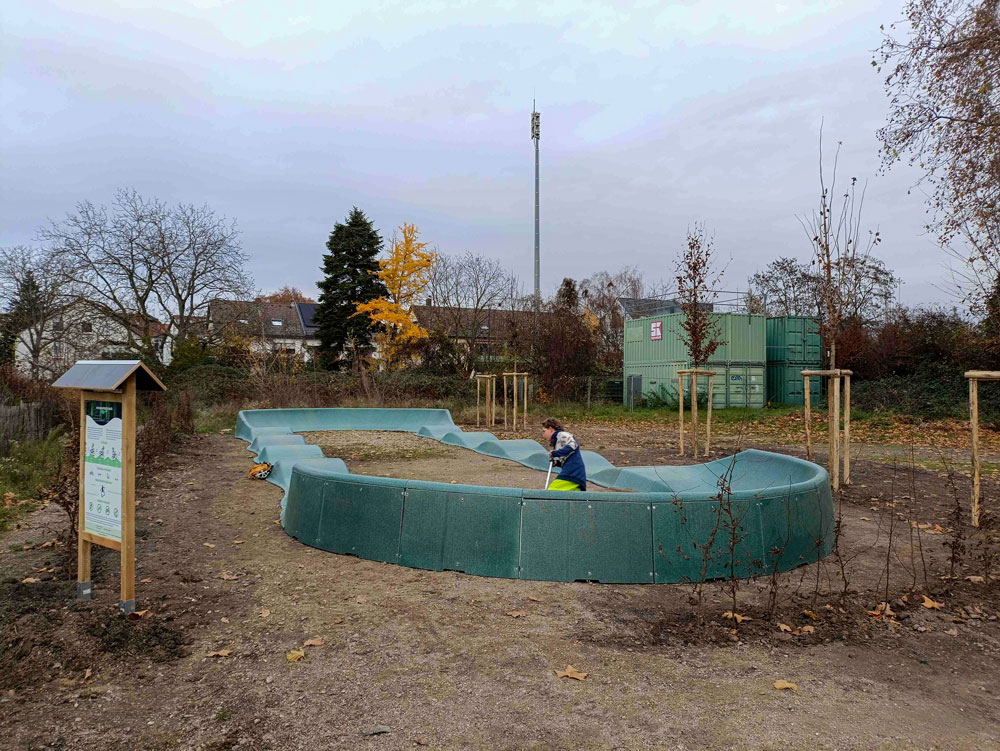Die größte Attraktion ist der Pumptrack, der vor 2 Wochen neben dem Brückl aufgebaut wurde. Es konnten zusätzlich fünf große Bäume gepflanzt werden und eine Hainbuchenhecke mit 60 Pflanzen, demnächst kommt noch Erde, weitere Pflanzen, Sonnensegel, Bänke und alles, was man braucht, damit der Platz auch schön wird.